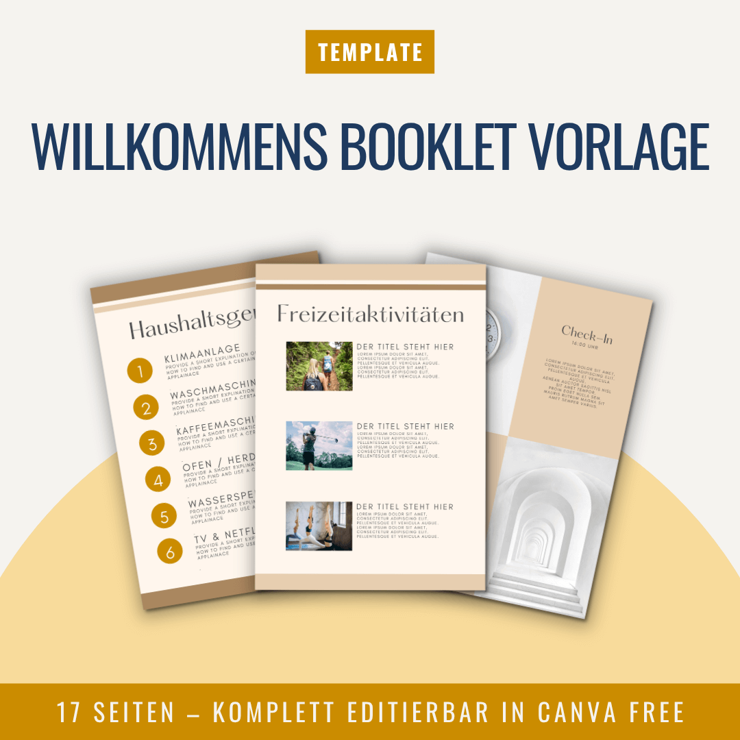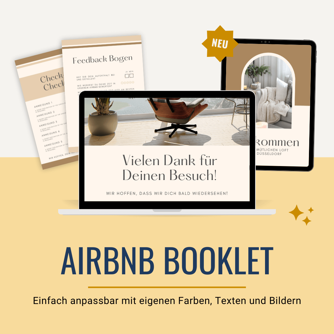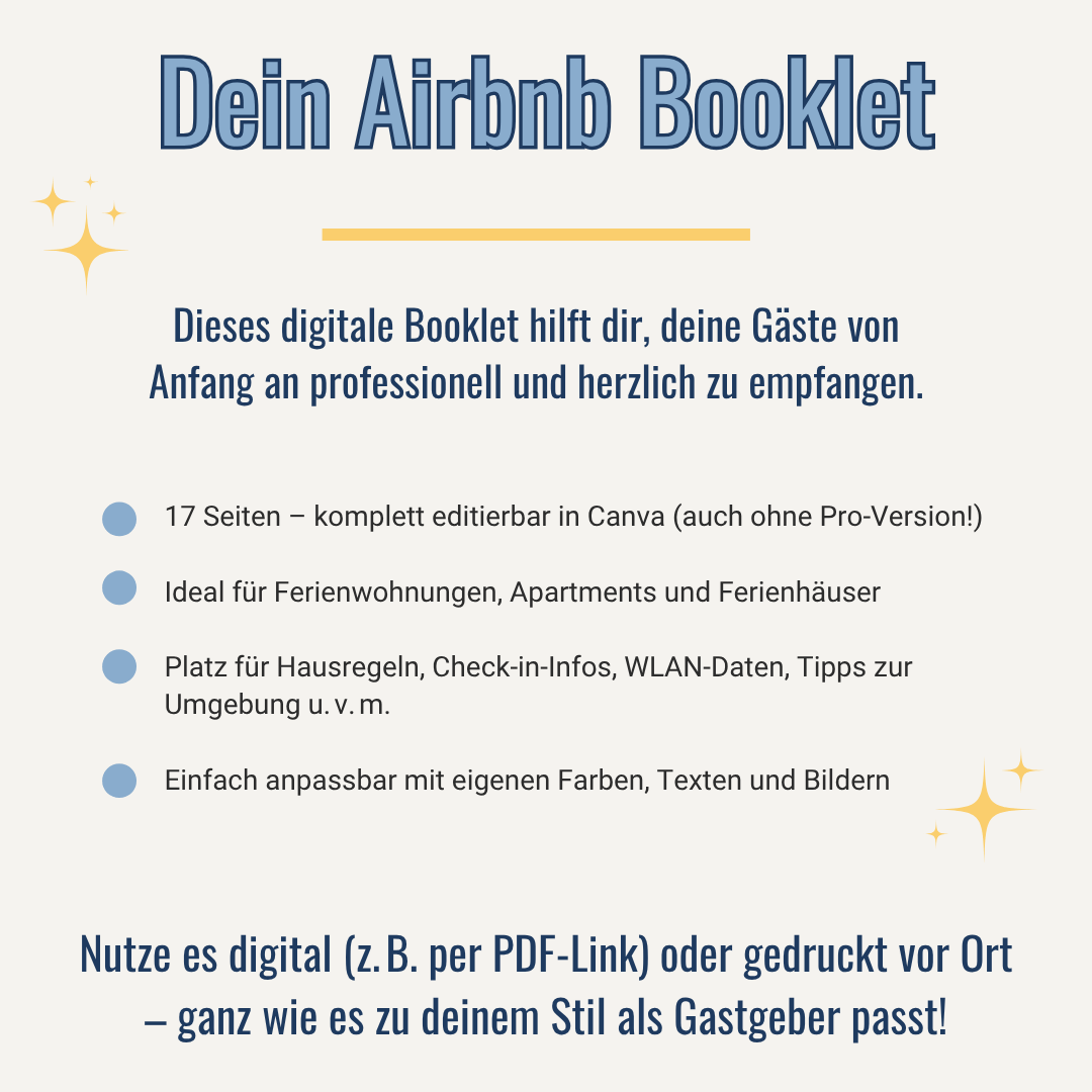 Mit dem 17-seitigen Airbnb Willkommens-Booklet gestaltest du eine Willkommensmappe, die deine Gäste nicht nur informiert, sondern auch beeindruckt. Kein mühsames Zusammensuchen mehr, keine losen Zettel auf dem Küchentisch – du präsentierst alles Wichtige in einem übersichtlichen, liebevoll gestalteten Booklet.