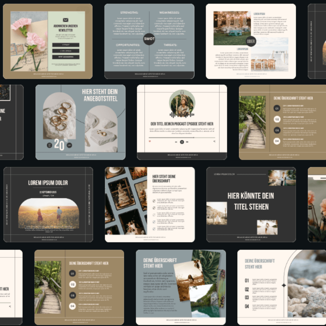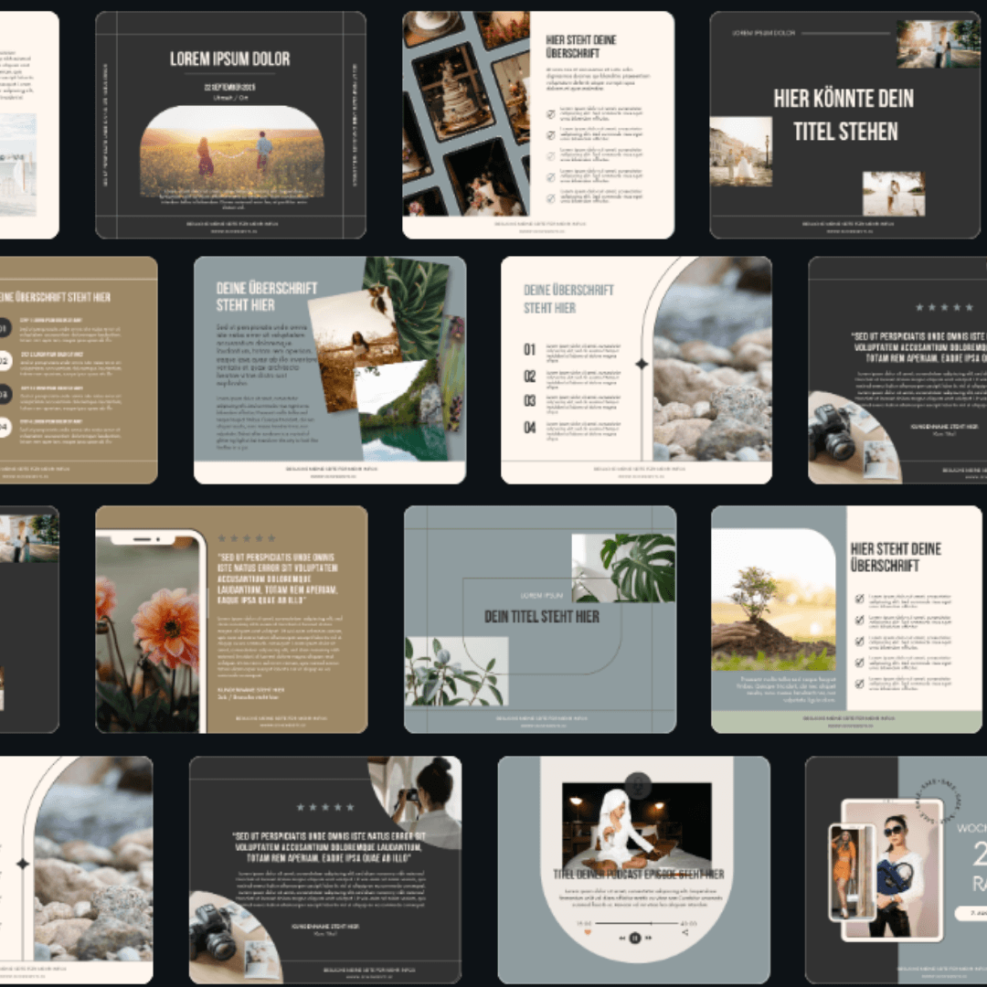 Die Vorlagen sind vollständig individualisierbar: Farben, Schriftarten, Texte, Fotos, alles lässt sich anpassen. Du brauchst kein Designwissen oder technisches Know-how. Öffne einfach Canva (kostenlos), passe die Vorlagen per Drag & Drop an und schon kannst du posten.