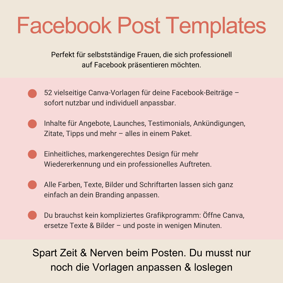 Dieses umfassende Template-Set enthält über 52 Vorlagen für Facebook-Posts, die du ganz einfach in Canva bearbeiten kannst – ohne Vorkenntnisse, ohne Stress. Es richtet sich gezielt an Frauen, die sich selbstständig machen, als Coach, Dienstleisterin, Shopbetreiberin oder lokale Unternehmerin. Du bekommst ein Tool, mit dem du in kürzester Zeit professionelle Inhalte erstellen kannst, die zu deinem Branding passen.